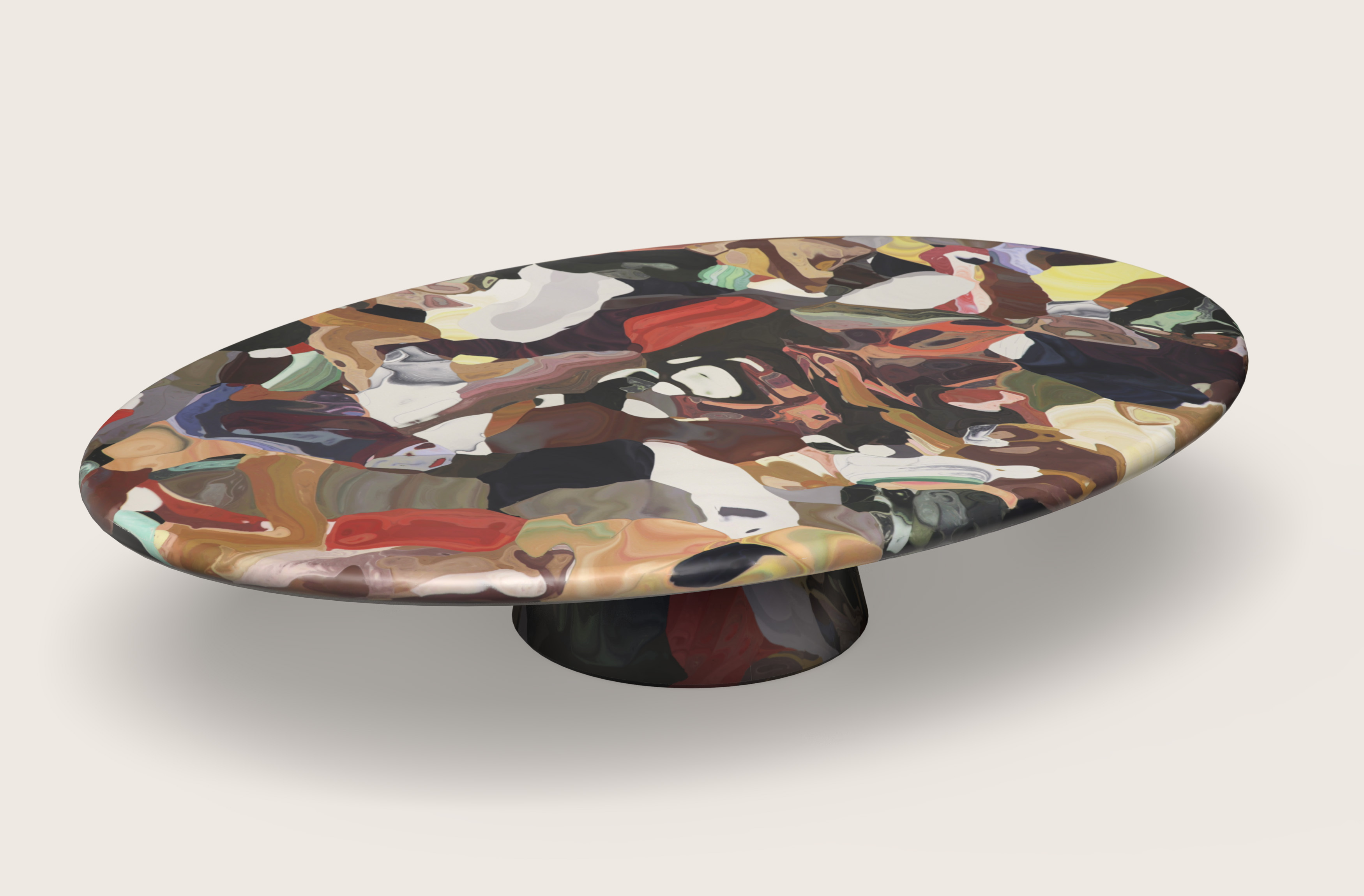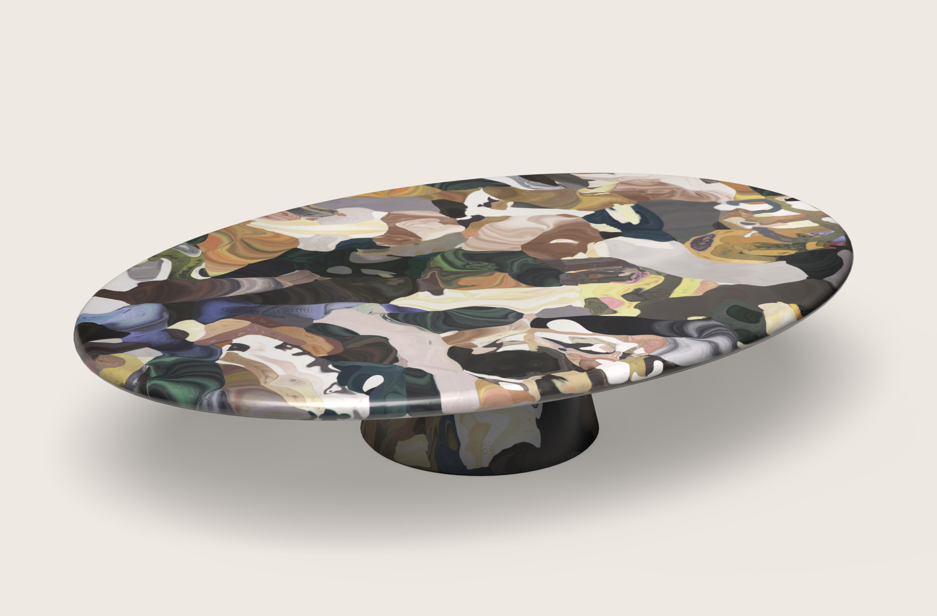 The 160cm wide coffee tables sees broad swatches of 3D printed material fossilized as otherworldly artefacts. Low to the ground, the table invites intimate observation, as feathers of intricate detail reveal themselves to patient viewers.