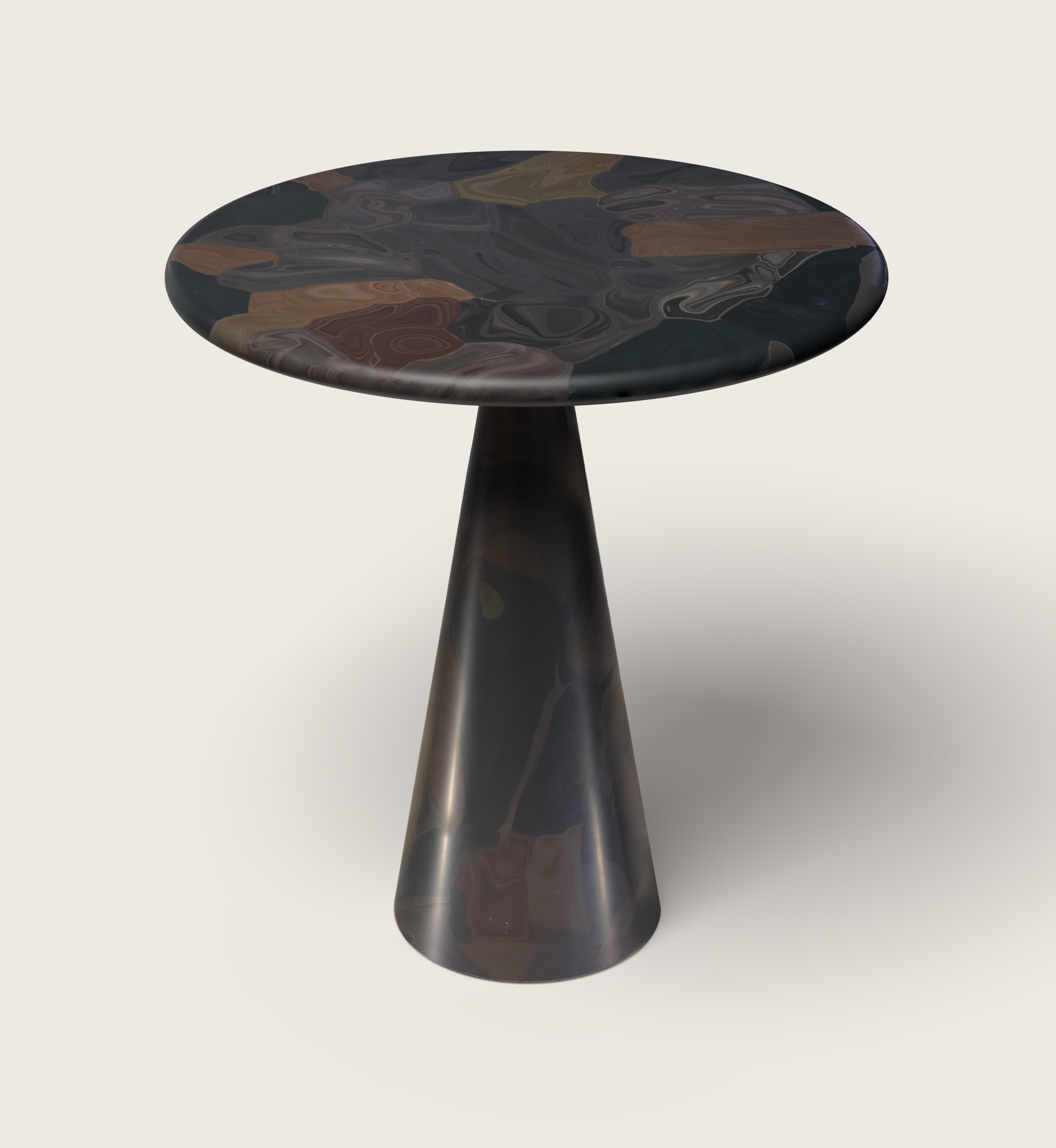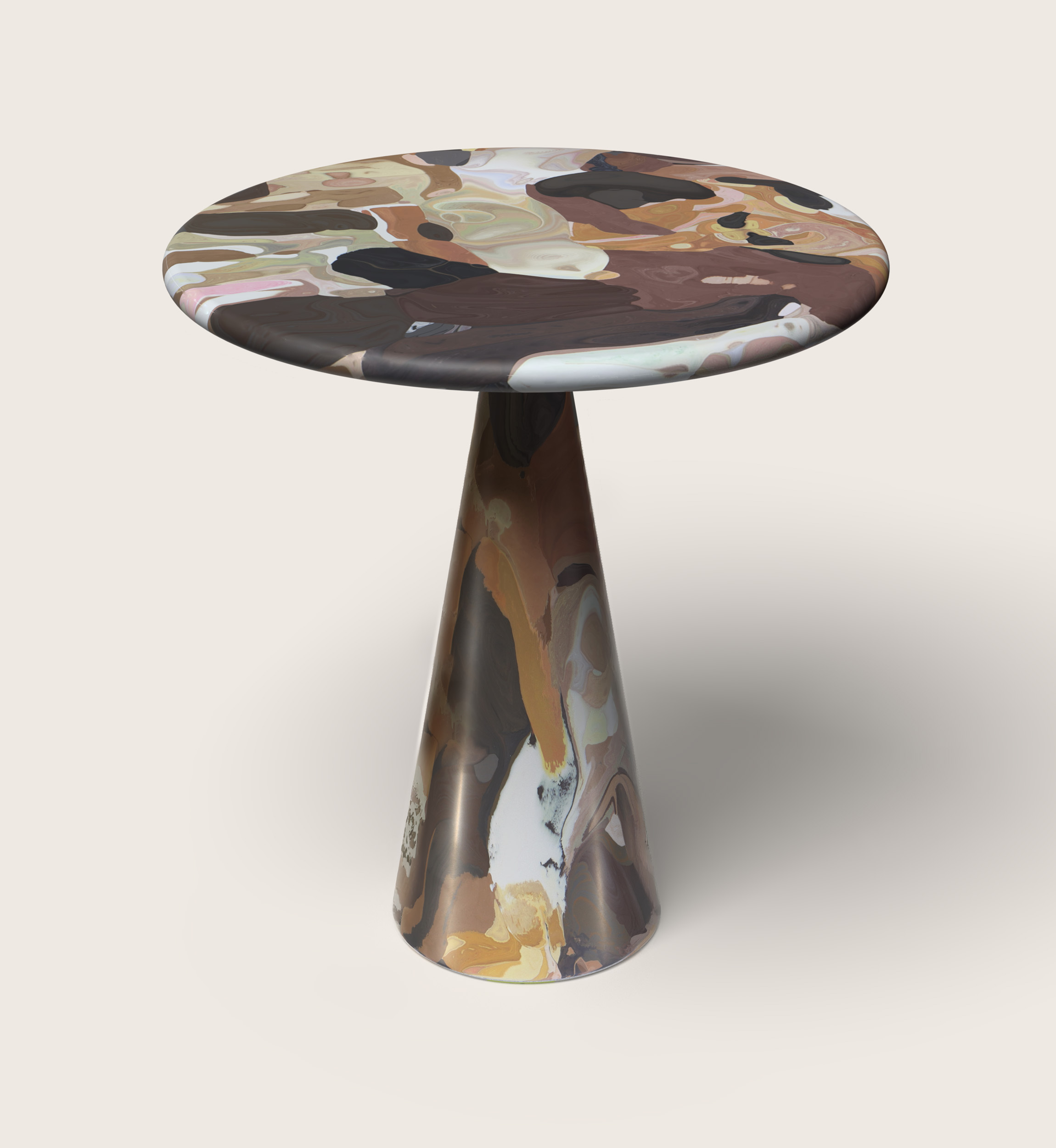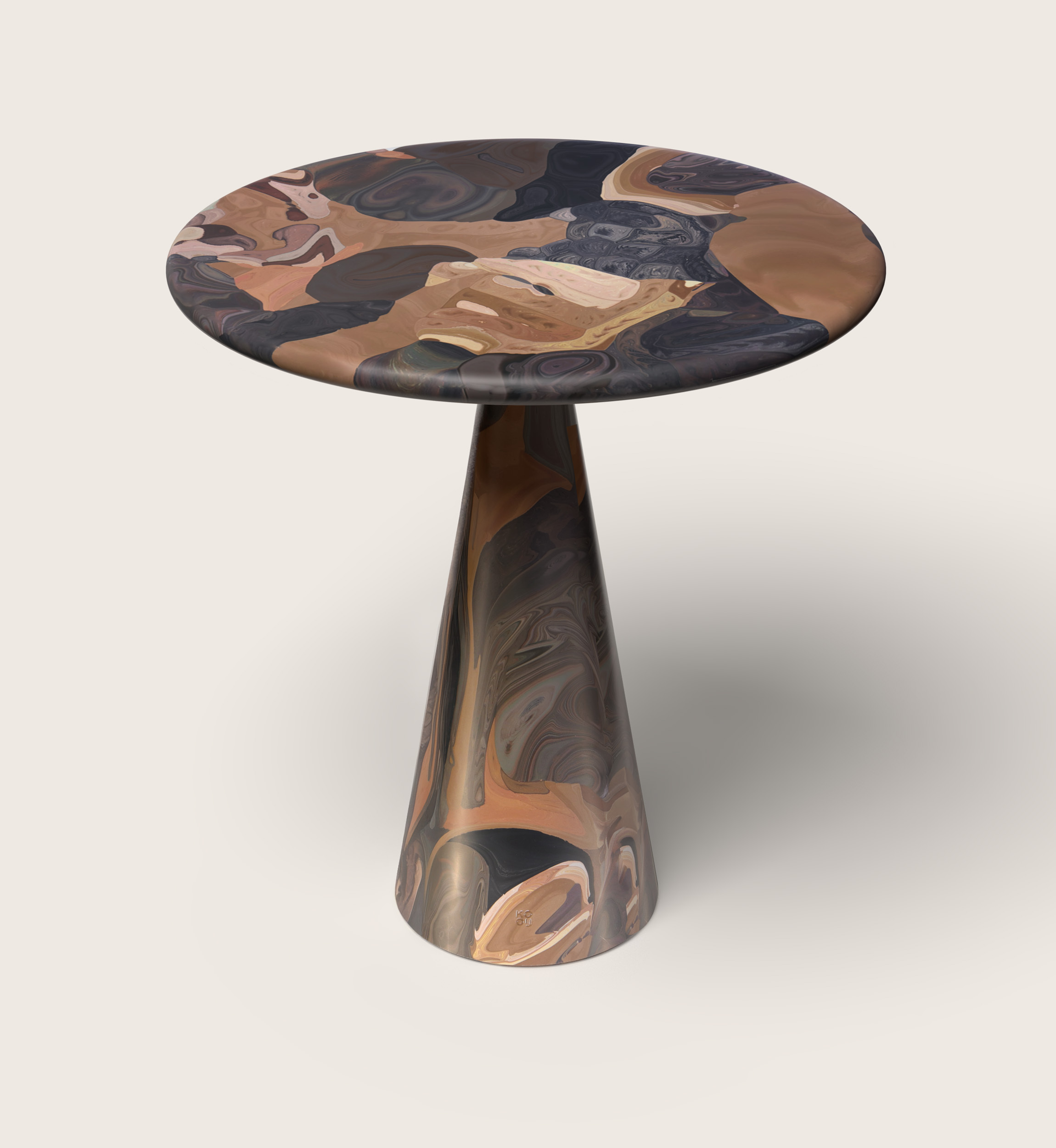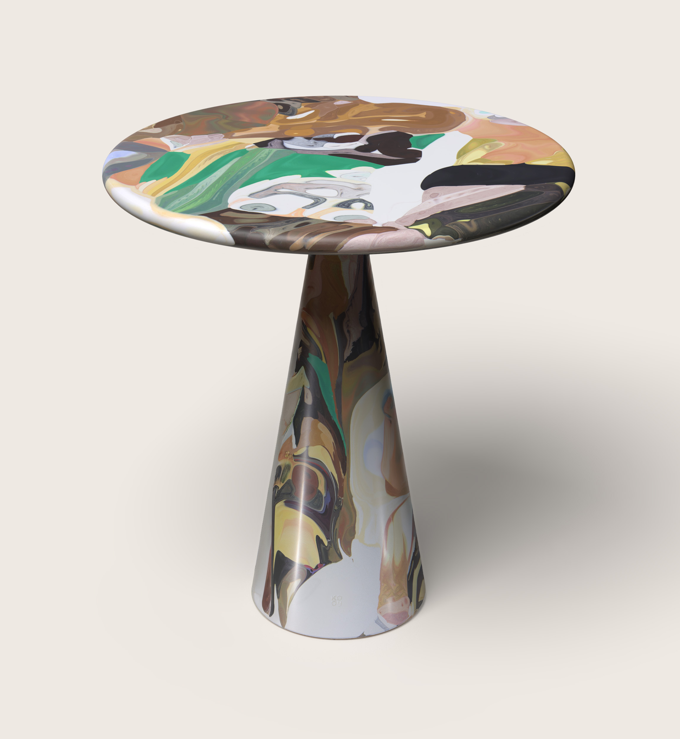 Dirk van der Kooij, 2014 Invitingly proportioned just for two, the Meltingpot bistro table is practical, playful, and romantic. The narrow leg garners most of the attention, as heated material swirls and swooshes around a conical mould. |